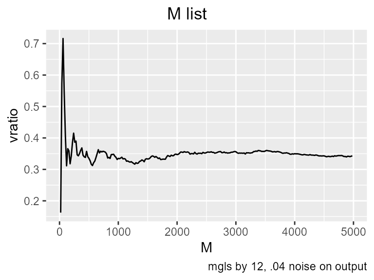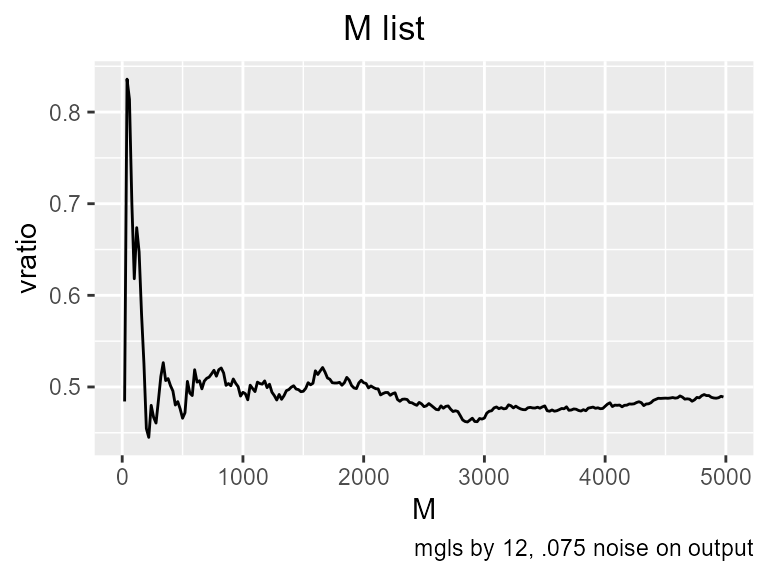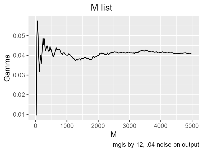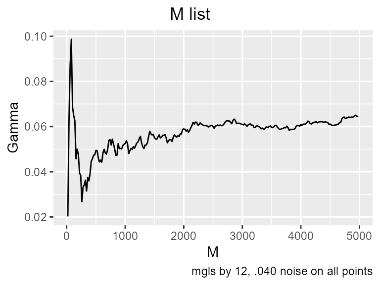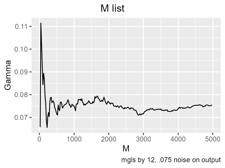 #> [1] 0.4889851Gamma’s estimate of noise is quite accurate. We have a lot of data, but the M list on the .075 variance data, when the noise is about half of the signal, shows that Gamma only starts to get stable around a sample size of 4500.