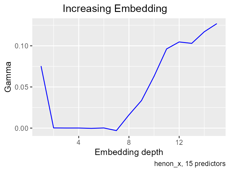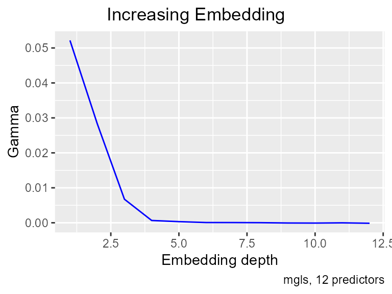 To find the right embedding, we use an increasing embedding search. This takes the lag 1 predictor and measures Gamma. Then it uses lags 1 and 2, measuring Gamma while adding an additional lag at each step. The result is usually examined visually. The increasing_search function returns a data frame, and plots it unless you set plot = FALSE,