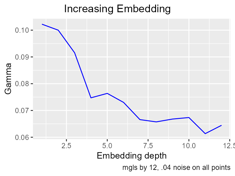 Gamma estimates noise - mean squared error. This plot shows Gamma dropping to almost zero with an embedding of 2, in other words, Gamma immediately recognizes the causality in the data. You wont get graphs like this very often with real data. Beyond an embedding of 7, gamma starts to rise again, because the extraneous variables obscure the smooth relationship.