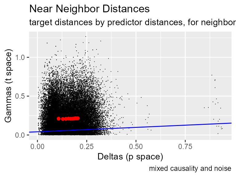 This plot uses the .04 noise data set; it shows causality with noise. In the plot, the Gamma regression line has positive slope. This indicates the presence of a smooth relationship because, on average, a point’s first nearest neighbor is closer in output space than its second and third. The intercept is above 0, indicating the presence of noise. The vratio is 0.34, so estimated noise is 34% of the sample variance, and we should be able to build a model with that mean squared error.