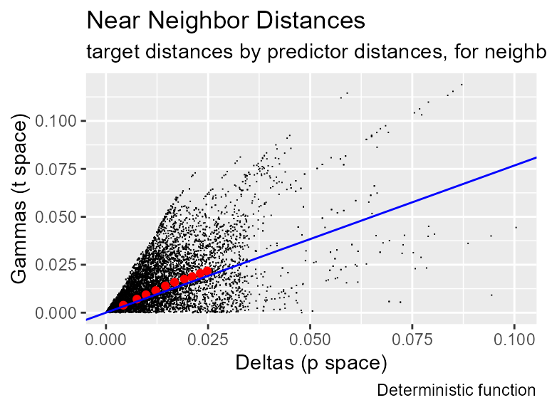 The black dots are the distances in output space (y) plotted against distances to near neighbors in the input space (x) . The red dots are the average distances for the first, second, third and so on nearest neighbors. The Gamma regression line in blue is drawn using the squares of those averages. As data density increases, the y intercept of the gamma regression line converges on the noise variance.