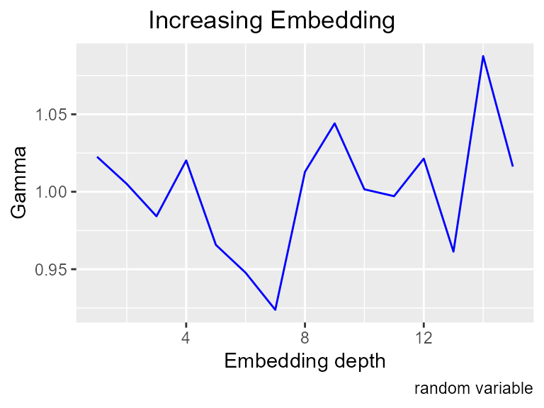 Looking at the graph, one might imagine that an embedding of 6 would be somehow better than 2, “more stable” or whatever. But if the lags between 3 and 6 added any information, Gamma would go down. In this case, of course, they can’t add information, because the mean squared error estimate is already zero. But in general, when you see a long flat floor on the increasing embedding search, the causality is at the beginning. Those additional variables are not confirming votes, it’s just that the relationship is strong enough that it is not obscured by a few random variables.