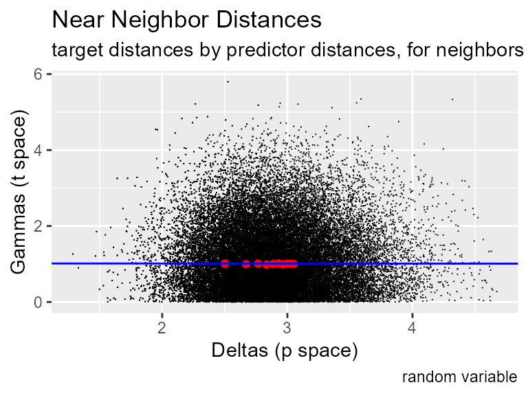 In this plot we see pure noise. The distances to near neighbors in output space have no relation to the distance in input space, so the Gamma regression line is horizontal. The y intercept is at 1, and the vratio is 1. Gamma is telling us, correctly, that all of the variance in this data comes from noise, the predictors have no smooth relationship with the target.